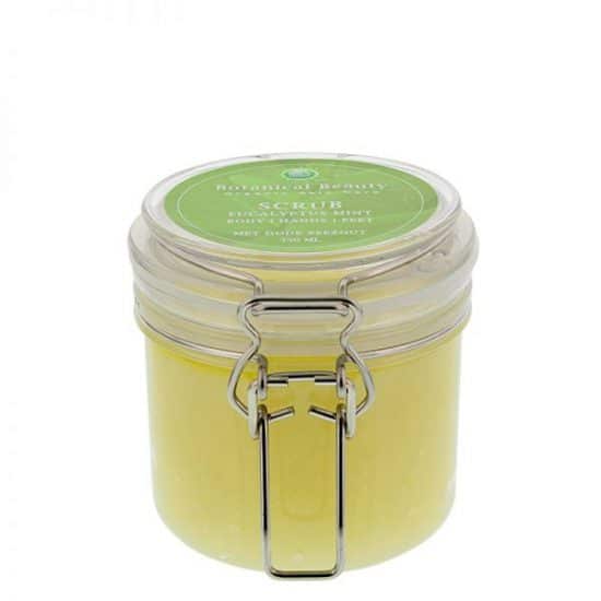 Eucalyptus-mint-rozemarijn werkt verfrissend, verkoelend en schimmelwerend. Daarnaast heeft het een positieve uitwerking op de luchtwegen en helpt het bij het afvoeren van slijm. Eucalyptus-mint-rozemarijn is heilzaam bij gordelroos, hoofdpijn, zenuwpijn en koorts. Eucalyptus-mint-rozemarijn kan bijdragen aan het verbeteren van de doorbloeding van de huid. Body Scrub Eucalyptus-Mint- Rozemarijn is daarom heilzaam bij winterhanden en -voeten. Ook kan Body Scrub Eucalyptus-Mint-Rozemarijn, door de schimmelwerende werking helpen bij de behandeling van mycose nagels. Daarnaast heeft de Scrub een effectieve, verzorgende werking bij droge (scheen)benen, ellebogen, knieën, hielen, onregelmatige huid op de bovenarmen, voeten en billen en bij droge handen.