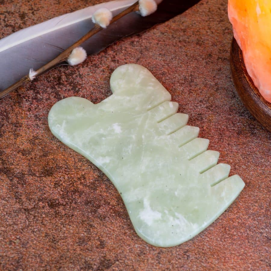 Guasha schraper van Jade in de vorm van een kam.