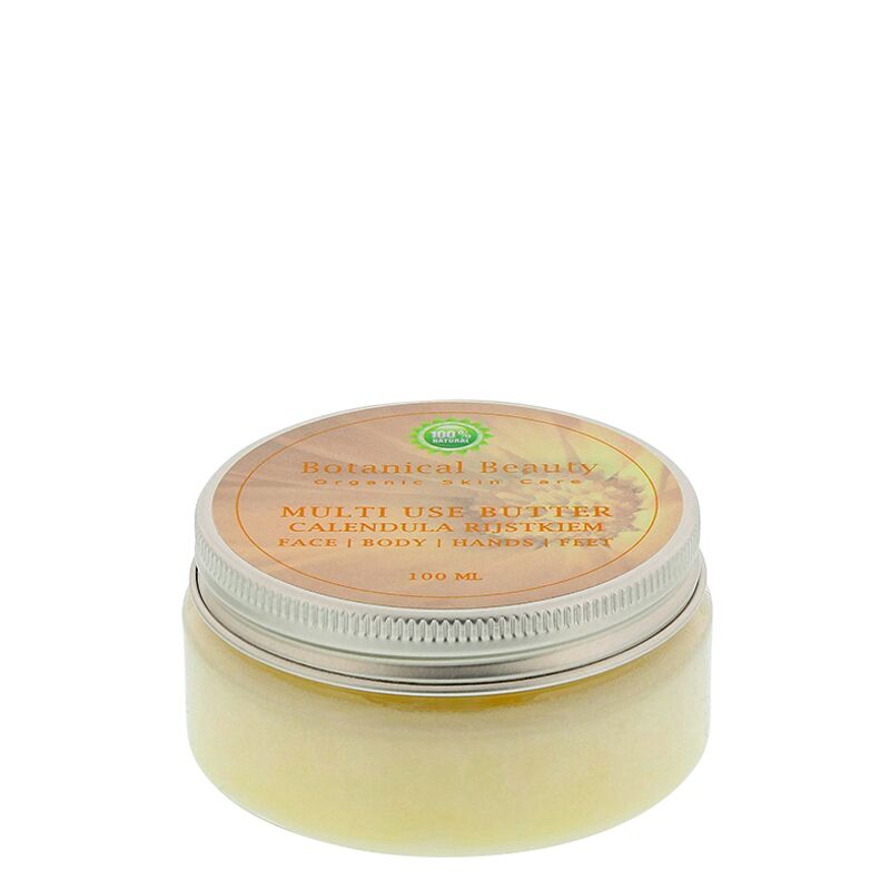 De butter bestaat voor 100% uit sheabutter koudgeperste druivenpitolie, avocado-olie, rijstkiemolie en jojobaolie verkregen uit de eerste persing. Multi Use Butter Calendula-Rijstkiem maakt zelfs de meest extreem droge en vochtarme huid weer soepel, zijdezacht en heerlijk comfortabel. Doordat er aan deze butter geen essentiële olie is toegevoegd is Multi Use Butter Calendula-Rijstkiem geurloos. Daarnaast is het geschikt voor mensen met een notenallergie. Multi Use Butter Calendula-Rijstkiem is zeer huidvriendelijk, verzachtend en ontspannend en is zodoende uitermate geschikt voor toepassing op de overgevoelige huid, de door problemen aangedane huid, de bestraalde huid en de baby- en kinderhuid. Daarnaast is Multi Use Butter Calendula-Rijstkiem geschikt voor mensen met een notenallergie en helpt het bij de vermindering van abcessen, acné en wratten. Ook werkt het antibacterieel, ontstekingsremmend en is het heilzaam bij jeuk veroorzaakt door insectenbeten. De butter helpt bij het stimuleren van de lymfe en bij het verzorgen van de droge en beschadigde huid en van striae, littekens en kneuzingen. De Multi Use Butter Calendula-Rijstkiem helpt bij de vermindering van rimpels en schilfertjes en heeft een positieve invloed op de natuurlijke vochtbalans van de huid. Daarnaast heeft het een effectieve, verzorgende werking bij droge (scheen)benen, ellebogen, knieën, hielen, voeten en bij droge handen. Multi Use Butter stimuleert het natuurlijk herstellend vermogen van de huid. Daardoor werkt het heilzaam bij het verminderen huidveroudering, vervellen van de huid, jeuk bij eczeem, insectenbeten en huidprikkeling door brandnetels. Sheabutter,